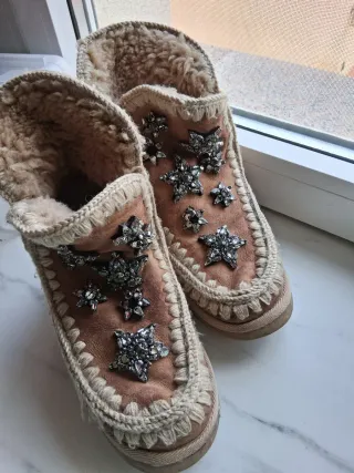 Botas de la marca Mou con un diseño único. Usadas. - Decoradas con aplicaciones de estrellas plateadas. - Forro interior de pelo suave. - Acabado exterior en ante.