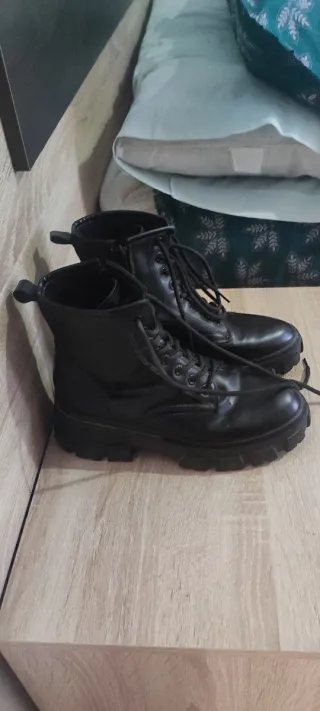 Botas negras con un diseño moderno y versátil. - Cierre lateral con cremallera. - Suela gruesa y resistente. - Detalle de tirador en la parte trasera. tiene la punta un poco dañada pero se puede arreglar pegándolo acepto ofertas