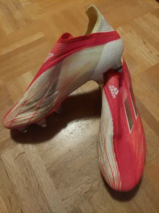 Botas de fútbol Adidas X Speedflow en color rojo y blanco. Diseñadas para la velocidad y el control en el campo. Talla 40 ⅔ - Parte superior de tejido. - Cierre sin cordones. - Suela para césped artificial o natural.