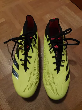 Botas de fútbol Adidas con un diseño llamativo en amarillo y detalles en rosa. Talla 40⅔ - Tecnología HybridTouch 2.0. - Cordones negros. - Suela para césped artificial.