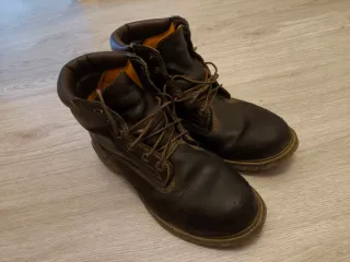 Botas Timberland de cuero marrón. Un clásico para el día a día. - Cierre con cordones. - Cuello acolchado para mayor comodidad. - Suela de goma resistente. Botas de muy alta calidad que han tenido bastante uso. Siguen siendo funcionales, las cambio porque quiero unas barefoot, pero me han sido sumamente cómodas. Tienen desgaste evidente por el uso, de ahí el precio.