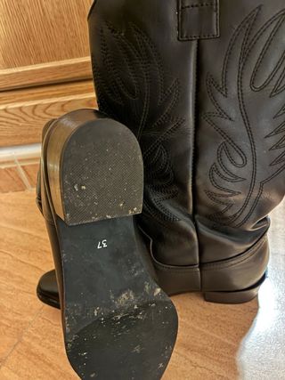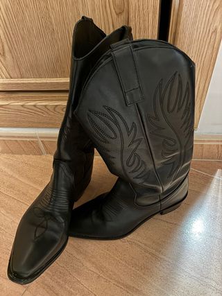 Botas de cuero estilo cowboy en color negro. - Diseño clásico con costuras decorativas. - Punta cuadrada. - Caña alta.
