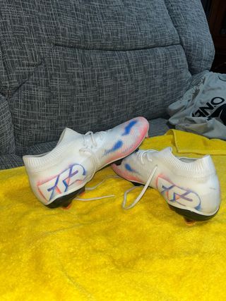 Botas de fútbol Puma con un diseño llamativo. - Combinación de colores blanco, azul y rosa. - Detalle gráfico en los laterales. - Usadas 1 vez. Algo negociable