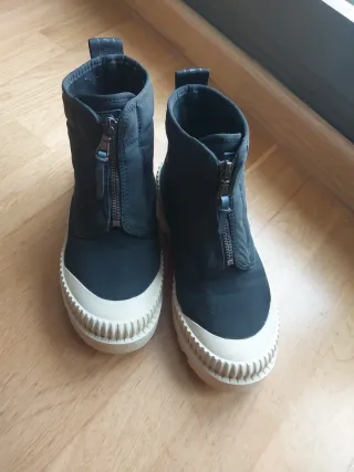 Talla 37.5. Color verde. Las he usado muy poco. Me quedan grandes por eso las vendo. Son impermeables. Muy bonitas, cálidas y cómodas. En la bota derecha, como puedes apreciar en la foto, hay un raspón o algo parecido.