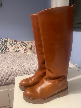 Botas altas de cuero en color marrón, talla 38. Se encuentran en muy buen estado, casi nuevas. - Incluyen su caja original.