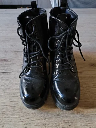 Botas de mujer de estilo militar, con un acabado brillante. - Cierre de cordones. - Cremallera lateral. - Diseño de caña alta.
