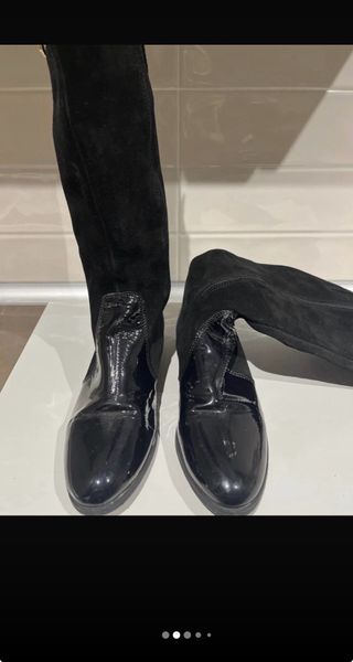 Botas altas de estilo moderno y elegante. - Material exterior de ante y piel. - Tacón grueso y plataforma. - Cierre de cremallera lateral. Usadas muy pocas veces, muy bien conservadas.