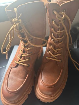 Botas de piel de la marca Zara en color beige. Un básico para tu armario. - Cierre con cordones y cremallera lateral. - Suela gruesa y resistente. - Detalle de tirador en la parte trasera.