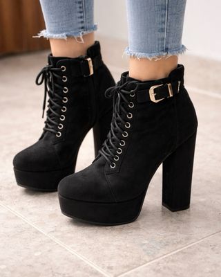 Botines de tacón con un diseño moderno y elegante. - Cierre de cordones. - Detalle de hebilla dorada. - Plataforma delantera. - Tacón grueso.