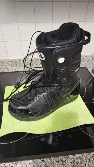 Botas de snowboard con un diseño moderno y cómodo, tener en cuenta que la talla es solo una referencia ya que es un calzado totalmente forrado y muy cómodo a la hora de abrochar. - Exterior en color negro. - Detalles interiores en color verde. - Cierre de cordones. - Muy buen estado.
