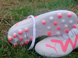 Botas de fútbol Puma para niños en talla 29. Diseñadas para ofrecer comodidad y rendimiento en el campo. - Color blanco con detalles en rosa. - Cierre con cordones. - Suela con tacos para césped artificial o natural.