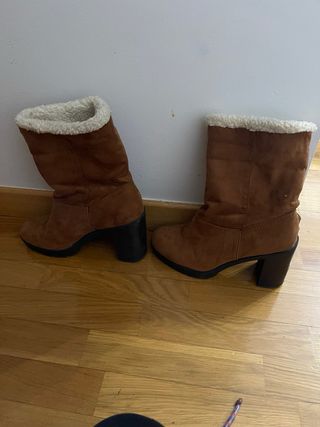 Botas de caña media con forro interior de pelo. - Material exterior tipo ante. - Tacón grueso y suela de goma. - Detalle metálico en el lateral.