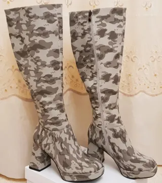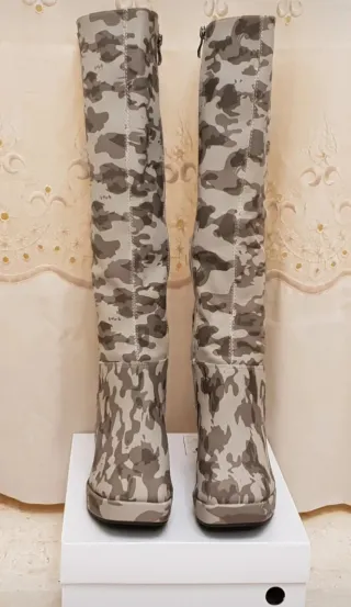 Botas de estilo militar con un diseño de camuflaje en tonos beige y gris. Perfectas para añadir un toque distintivo a tu atuendo. - Diseño de camuflaje. - Cremallera lateral para facilitar el acceso. - Tacón grueso para mayor comodidad.