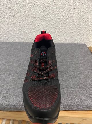 Botas de seguridad con un diseño moderno y deportivo. - Combinación de colores negro y rojo. - Material exterior de malla transpirable. - Suela de goma resistente.