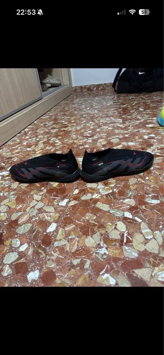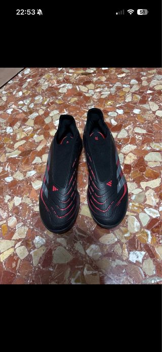 Botas de fútbol Adidas Predator suela turf. Diseñadas para un buen agarre en campos de césped artificial. - Exterior en negro con detalles en rojo. - Cierre con cordones rojos. - Interior forrado en rojo. - Suela específica para turf. Tienen 3 puestas, en la primera ya vi que no me estaban bien y dos más intentando calzarlas con plantillas algodón etc. Ya no podia descambiarlas porque se habia borrado lo de predator de dentro. Están nuevas. El tallaje es pequeño, si tienes un 44 o 45 te estarán bien.