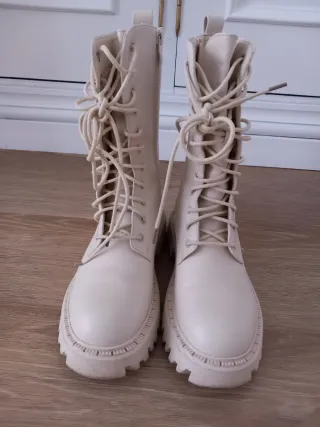 Botas militares de media con cordones. - Color blanco roto. - Suela gruesa y dentada. - Cierre de cremallera lateral.