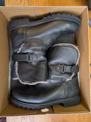 Botas de cuero negro Panama Jack modelo Felia. Poco uso con buen estado. Se vende por falta de uso. - Cierre con correa y hebilla. - Forro interior de pelo sintético. - Suela de goma antideslizante. - Fabricadas en España.