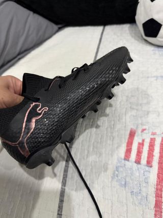 Botas de fútbol Puma Future en color negro con detalles en oro. - Diseño moderno y llamativo. - Materiales de calidad para un buen rendimiento. - Suela con tacos para césped.