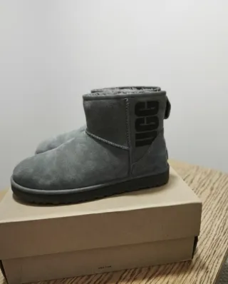 Botas de estilo clásico en color gris. Perfectas para mantener los pies calientes. Perfecto estado, me las he puesto tres veces. Vendo porque me quedan grandes. - Exterior de ante. - Interior forrado de borreguito. - Detalle de logo en el lateral.