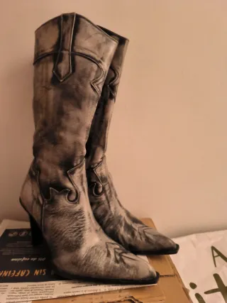 Botas de tacón con un diseño único y llamativo. - Acabado desgastado en blanco y negro. - Punta afilada. - Tacón alto.