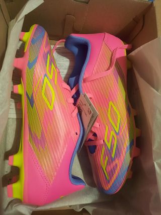 Botas de fútbol Adidas F50 con un diseño vibrante y llamativo. - Combinación de colores rosa, amarillo y azul. - Tacos para césped artificial y natural.