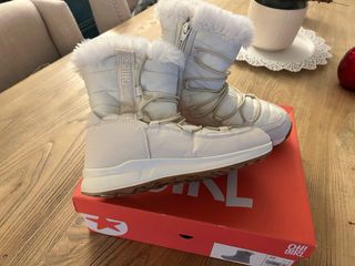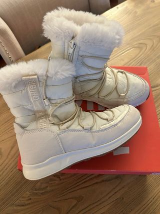 Botas de nieve para niña de la marca OH! GIRL. Muy poco uso. Muy calentitas. - Color blanco. - Talla 35. - Diseño acolchado con pelo. - Cierre con cordones y cremallera. Tengo dos parea iguales. Cada uno, 12€.