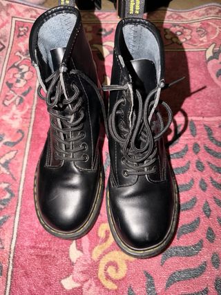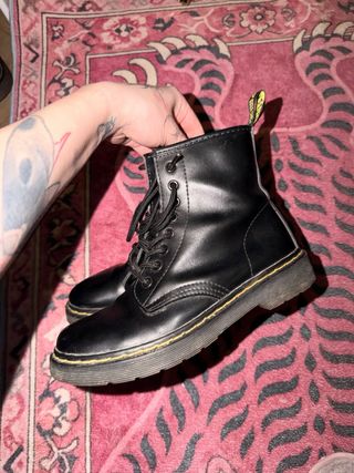 Botas de estilo Dr. Martens en color negro. Un clásico que no pasa de moda. Talla 38-38,5 - Diseño de caña alta. - Cierre con cordones. - Suela con pespunte amarillo característico.