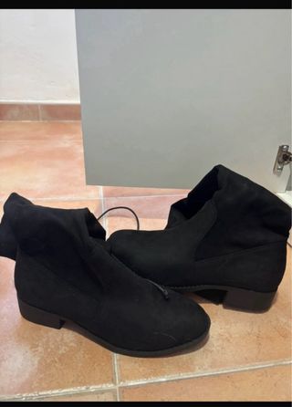 Botas de ante en color negro. Un calzado versátil y cómodo. Tiene una pequeña mancha en un lateral pero no se aprecia. - Material exterior de ante. - Cierre con cordones. - Suela de goma. - Diseño tipo botín.