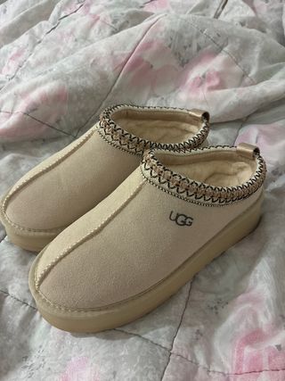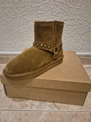Buenas! las compré de imitación en HACOO, pero lamentablemente pedi una talla mas grande. Solo las he usado 2 veces para ver si me quedaban😔. Ya tengo unas correctas y las recomiendo!!! Aunque cuidado con la lluvia. Originalmente me costaron 29€ en la app, por eso lo rebajo un poquito al usarlas solo para ver si que quedaban.😊 Botas o pantuflas UGG en color beige, ideales para estar cómodo en casa. - Diseño tipo slip-on. - Detalle de pespuntes en el exterior. - Logo de la marca bordado en el lateral.