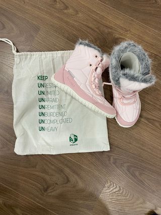 Botas de estilo barefoot en color rosa, perfectas para el frío. -Valoradas en 90€ - Cierre con cordones. - Detalle de pelo gris en el cuello. - Suela flexible y antideslizante.