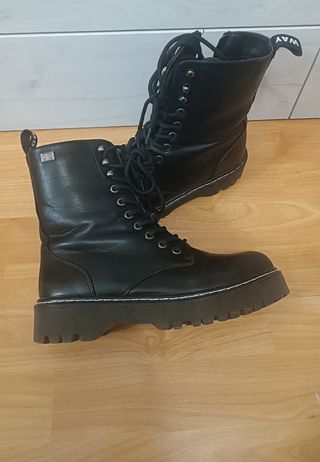 Botas unisex de estilo militar con cordones. Muy nuevas casi sin usar. Muy modernas y cómodas. - Diseño de caña alta. - Suela gruesa con plataforma. - Detalle de costura blanca en la suela. - Tirador trasero para facilitar su colocación. - Ojales metálicos para los cordones.