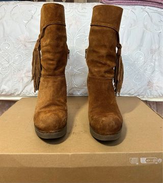 Botas de estilo casual en tono beige y marrón. - Diseño de caña media. - Suela plataforma gruesa. - Cierre de cremallera lateral. - Tienen el tacón un poco desgastado pero están bien