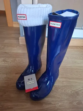 Botas de agua HUNTER altas de charol brillante altas. SIN ESTRENAR. Numero 39. CALCETINES si se quiere aparte - Color azul intenso. - Hebilla lateral decorativa. - Incluye calcetines de punto blanco para botas.