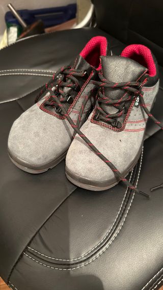 Botas de seguridad de la marca Ofma en talla 37. Combinan materiales resistentes para proteger tus pies. - Exterior en ante gris. - Detalle en color rojo. - Cordones negros con detalles rojos. - Suela de goma.