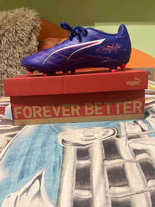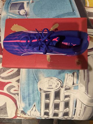 Botas de fútbol Puma Ultra con un solo uso. - Diseño en azul con detalles en rosa. - Suela con tacos para césped natural de goma. -Gama alta