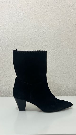 Botas de caña media con tacón y punta fina. - Material: Ante - Color: Negro - Talla: 37 - Detalle de borde festoneado en la caña - Tacón: 6cm - Caña: 19cm Súper buen estado porque las he usado muy poco (ver foto de la suela) #botaszara #zara #botasnegras #botas37 #zara37 #botasnegras37 #botaszara37