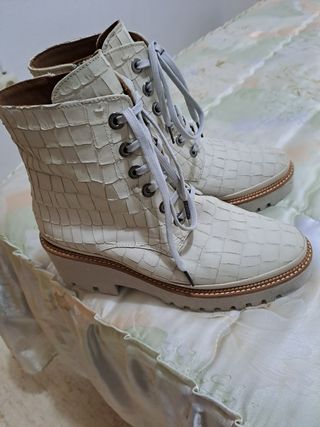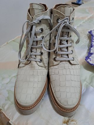 Botas de caña alta con cordones y suela gruesa en piel tonos gris y negro , muy bonitas y cómodas , casi nuevas , impecables . - Estampado de serpiente. - Cierre de cordones y cremallera lateral . - Diseño de caña alta.