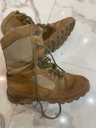 Botas militares de caña alta, ideales para senderismo o actividades al aire libre. - Material exterior de ante y lona. - Cordones de ajuste en color verde. - Suela de goma con buen agarre. - Diseño robusto y duradero.
