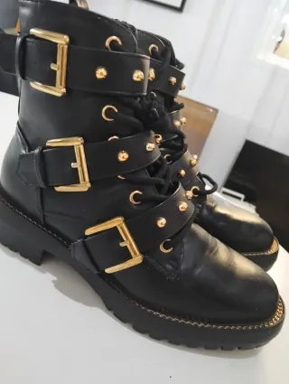 Botas de estilo motero con un diseño llamativo. - Cierre de cordones y cremallera lateral. - Múltiples correas con hebillas doradas. - Tachuelas doradas decorativas. - Detalle de cadena dorada en la suela.