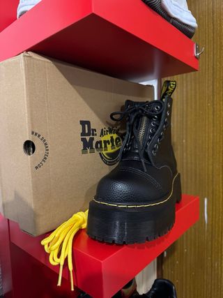 Botas de plataforma Dr. Martens en color negro. Cuentan con un diseño robusto y moderno. - Cierre de cremallera frontal. - Suela gruesa con costuras amarillas. - Cordones amarillos incluidos.