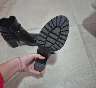 Botas de mujer de estilo motero con detalles metálicos. - Diseño de caña baja. - Cierre de cremallera lateral. - Tira decorativa con tachuelas. - Tacón grueso. Solo se han usado una vez. Tengo la caja.