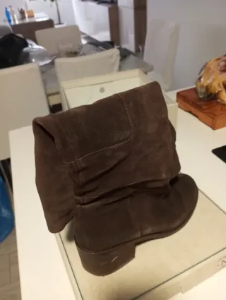 Botas de exterior Caprino Ante 100% y el forro interior cuero. Es una talla 40, aunque yo tengo el 39 y me van bien ya que los cordones hacen sujeción. La caña es fina, por lo que recomiendo para piernas delgadas. Es MUY COMODA y parece que los 9 cm de tacon ni los notas. Es una bota que estiliza las piernas ya que ni son de las muy altas ni muy bajas (la bota mide 30 cm) Ha tenido 2 puestas, por lo que están como nuevas. Puedes verlo por las fotos de la suela y el interior de la bota está nuevo. Tiene una cremallera detrás que hace que ponerlas y quitartelas sea muy fácil y no hace falta mover los cordones. Como si fueran NUEVAS