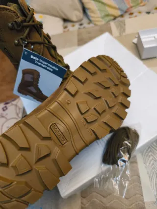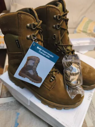 Botas militares de alta calidad, diseñadas para ofrecer protección y comodidad. - Material exterior de ante y textil. - Membrana Gore-Tex impermeable y transpirable. - Suela de goma resistente. - Cierre con cordones. - Incluye cordones de repuesto.