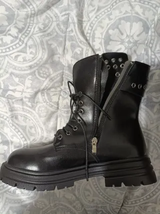 Botas nuevas negras. Las vendo porque no son de mi talla. Botas de estilo militar en color negro. Cuentan con un diseño moderno y detalles que las hacen únicas. - Cierre principal con cordones. - Cremallera lateral para facilitar el acceso. - Adornadas con tachuelas metálicas. - Suela gruesa y resistente. - Cuero vegano.