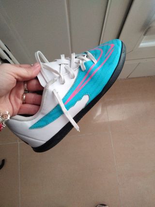 Botas de fútbol sala con un diseño llamativo. - Parte superior en azul con detalles en rosa. - Cordones blancos. - Suela de goma.