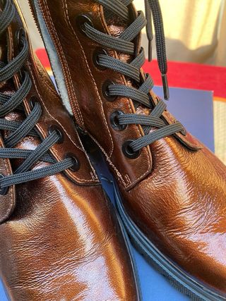 Botas de caña alta con cordones. - Material exterior de cuero con acabado brillante. - Suela de goma gruesa y resistente. - Cierre de cordones negros. - Diseño tipo militar. -Piel charol.