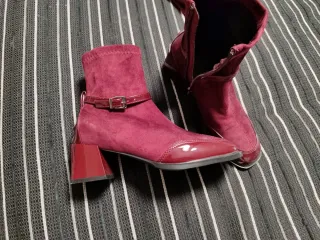 Botas de mujer con un diseño moderno y elegante. - Material exterior de ante sintético. - Detalle de charol brillante en la punta y el tacón. - Correa decorativa con hebilla plateada en el tobillo. - Tacón grueso y cómodo.