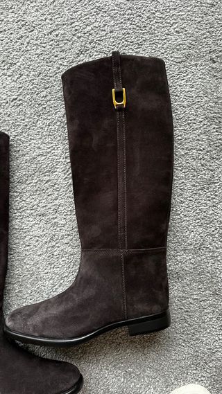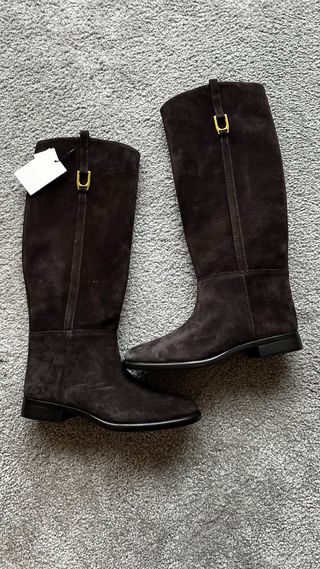 Preciosas botas altas estilo mosqueteras de Zara de cueroo piel vuelta ante en color marron chocolate. Con detalle de hebilla dorada lateral estilo hipica. Talla 37