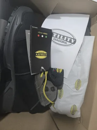 Botas de trabajo Diadora con un diseño moderno y resistente. - Color negro y gris. - Cordones amarillos. - Etiqueta con logo 'Utility Diadora' y 'Italian design'.