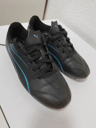Botas de fútbol Puma en talla 36. Combinan un diseño moderno con detalles en azul. - Color principal negro. - Detalles de diseño en azul. - Cierre con cordones.